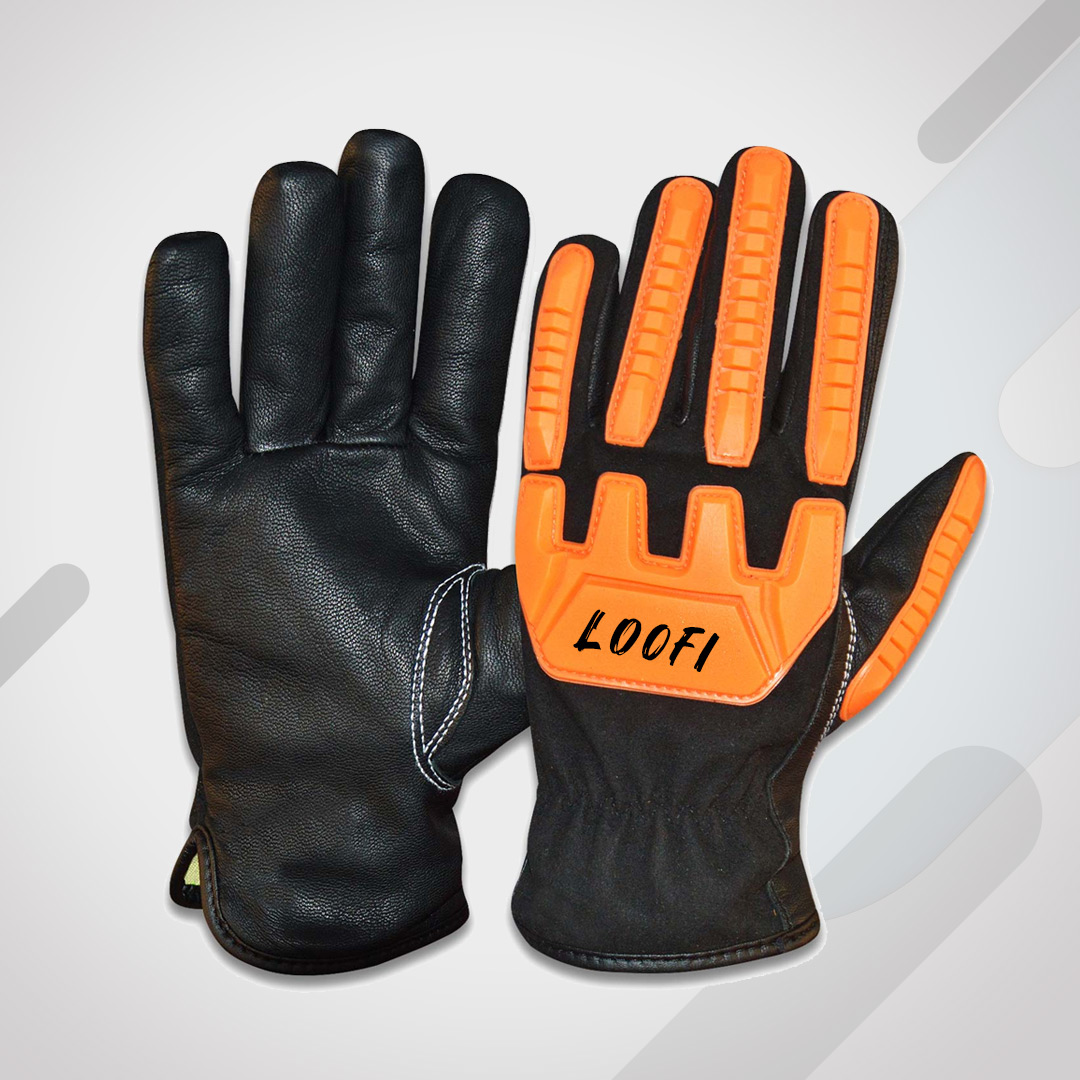 Mechanic Glove. Palm side Goatskin Leather and Back side Synthetic Leather. TPR on backside finger and Knuckle Area. Inside KEVAR liner yellow. Elastic on wrist.